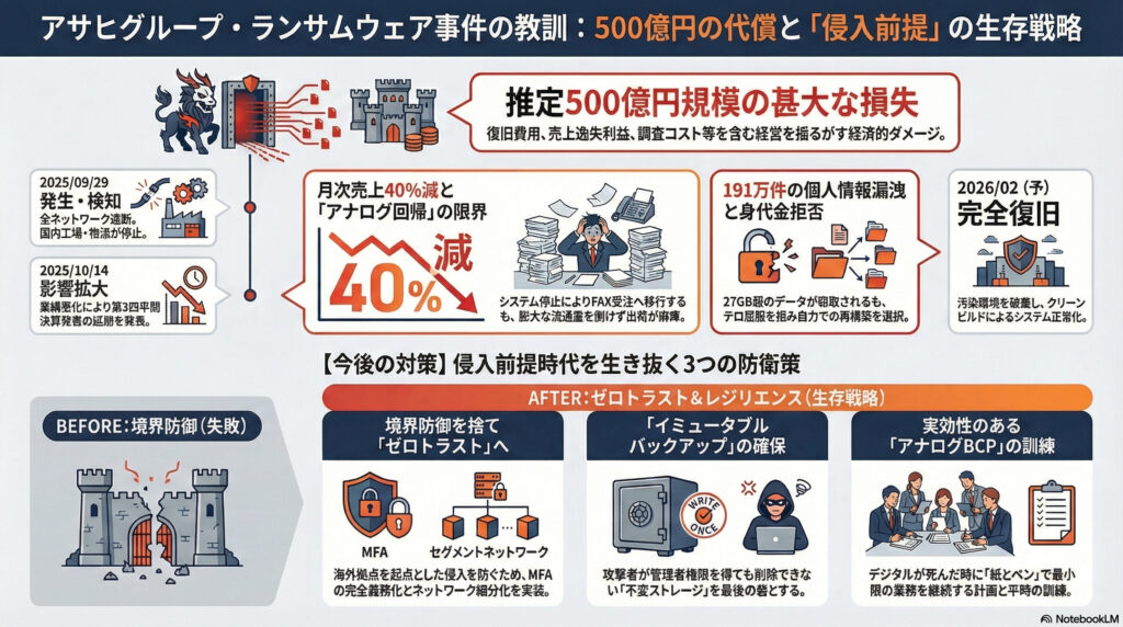 アサヒグループ・ランサムウェア事件は、約500億円規模の経済損失と5ヶ月に及ぶ業務麻痺という代償を払い、我々に「サイバー攻撃は経営リスクの最大事項である」という現実を突きつけました。