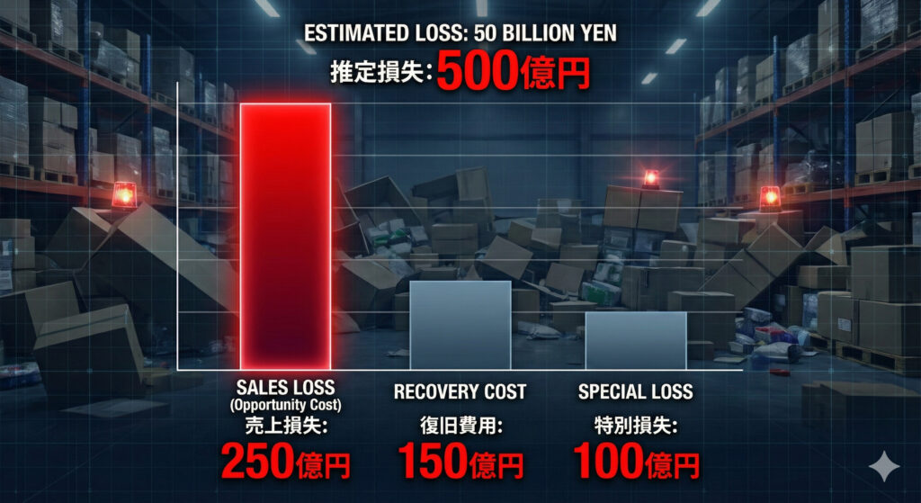 セキュリティ専門家の試算によれば、フォレンジック調査、システム復旧、代替業務コスト、そして数ヶ月にわたる売上逸失利益を含めた総損失額は、最大で約500億円規模に達する可能性があります。