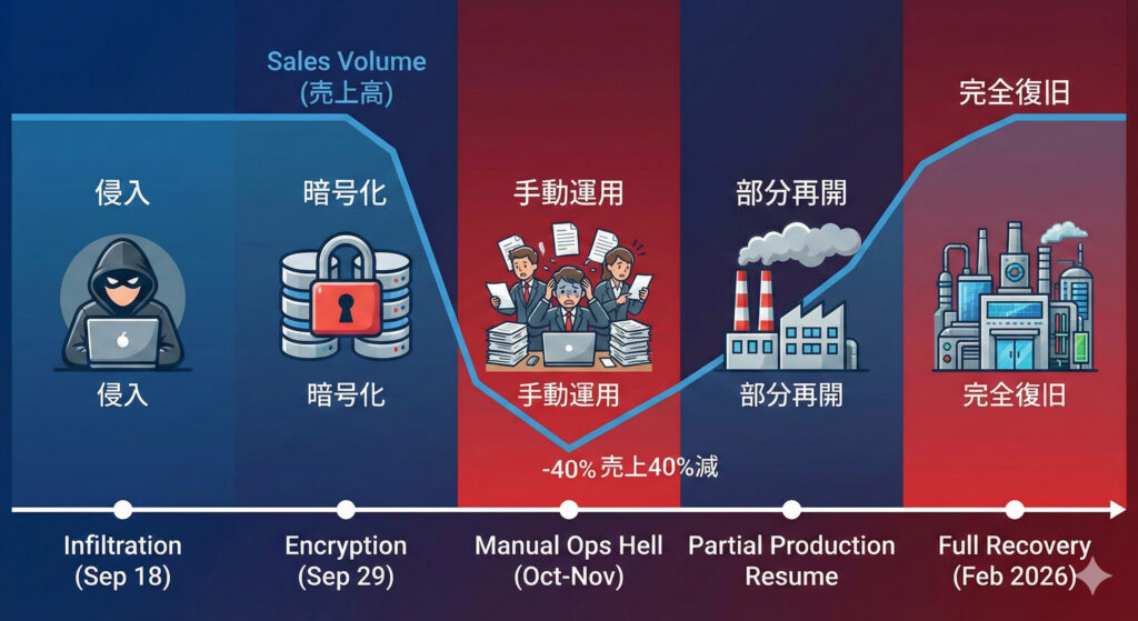本件の特異性は、エンドポイントだけでなくデータセンターの基幹システムそのものが暗号化され、物理的な「モノづくり」と「物流」が長期間麻痺した点にあります。ここでは、隠密裏に行われた侵入から、アナログ対応による苦闘、そして再起までの時系列を整理します。