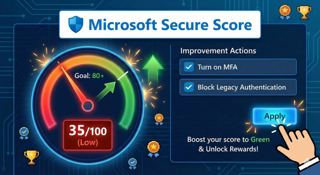 「管理者のMFAを有効にする」「レガシー認証をブロックする」といった推奨アクションが表示され、それを実行するだけで点数が上がります。
