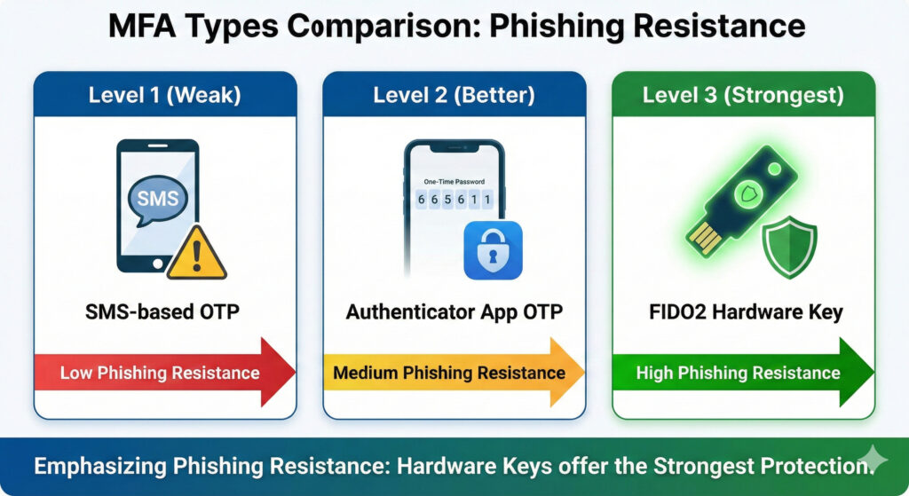 - 推奨: スマートフォンアプリによるOTP(ワンタイムパスワード)やプッシュ通知。