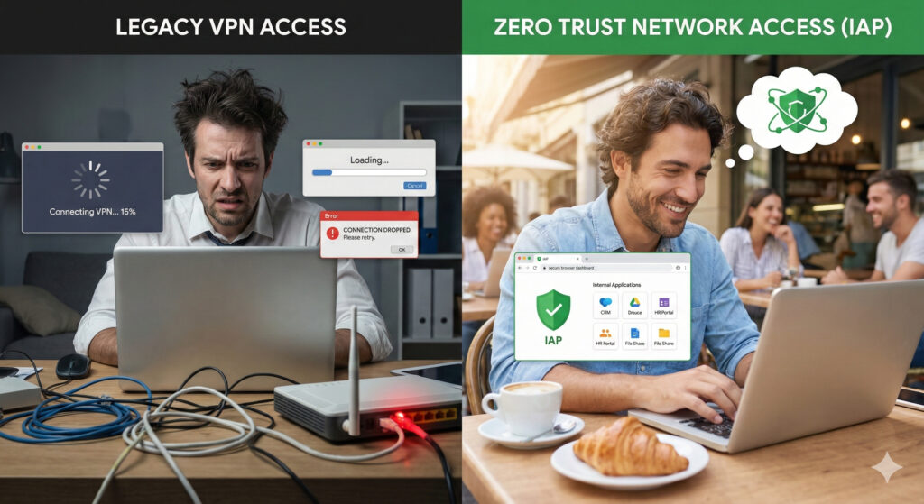 ゼロトラストの技術要素であるIAP(Identity Aware Proxy)やZTNA(Zero Trust Network Access)を導入すれば、この儀式は消滅します。